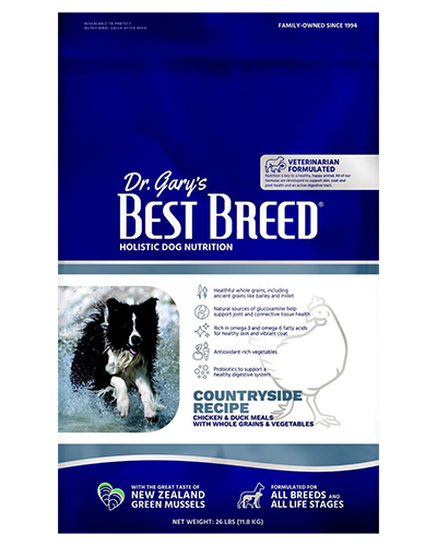 Dr. Gary’s Best Breed Countryside Recipe is a chicken and duck dog food made with a holistic blend of whole grains and vegetables. Suitable for all sizes and life stages. Made with all-natural chicken and duck, rich in essential amino acids. Antioxidant-rich vegetables, including tomatoes, carrots and spinach. Omega-3 and omega-6 fatty acids from whitefish for skin and coat. Natural sources of glucosamine for joint and connective tissue. Whole grains including brown rice, millet, and barley. Probiotics for nutrient absorption and digestion Enriched with taurine.