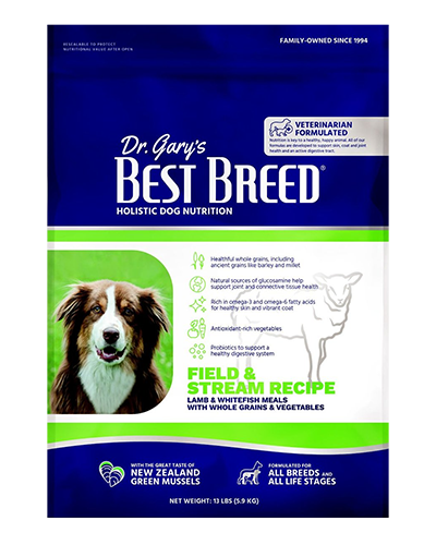 Dr. Gary’s Best Breed Field & Stream Recipe is an all-natural, chicken-free dry dog food with lamb and rice, featuring free-range, grass-fed lamb and whitefish. Chicken-free. Protein from free-range, grass-fed New Zealand lamb and whitefish. Balanced ratio of omega-3 and 6 fatty acids, and amino acids. Antioxidants from fruits and vegetables including blueberries, cranberries, carrots, tomatoes and spinach. Natural sources of glucosamine for joints.