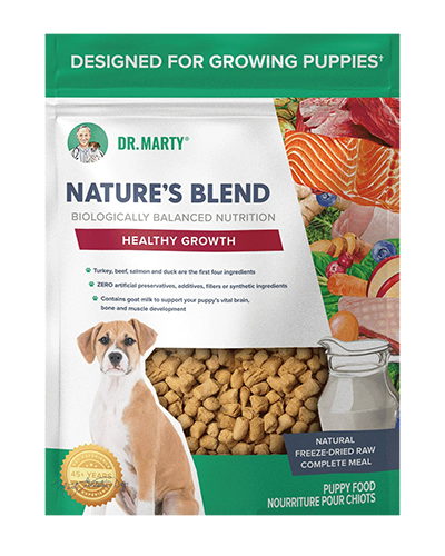 Dr. Marty Nature’s Blend – Healthy Growth is a premium freeze-dried raw food made specifically for growing puppies. It combines premium meat, vegetables, fruit, and key superfoods to support your dog’s strong muscles, sharp mind, healthy heart, active energy, easy digestion, and healthy immune system… with ZERO artificial preservatives, or fillers.