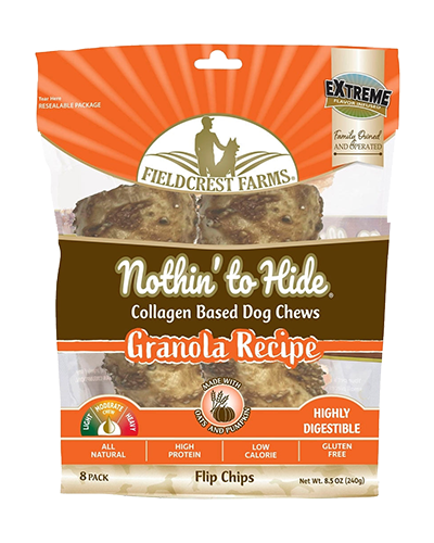 Fieldcrest Farms Nothin’ to Hide Flip Chips 8-count Granola Dog Chew Treats give your furry friend a healthy outlet for his desire to chew. Each chip is made of pumpkin and oats and packed with protein and collagen. The addition of collagen gives your pup support for a healthy digestive system and a great coat and skin. Collagen also can help reduce joint pain. Plus, at 75% protein, these low-fat chips pack a burst of powerful and healthy energy. While your furbaby chews, you can feel good knowing these treats are helping to support his dental health and they’re highly digestible.
