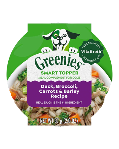 Make mealtime exciting or treat your dog to an irresistibly tasty snack with Greenies Smart Topper High Protein Wet Mix-in. This delicious meal complement for dogs features VitaBroth broth - bone broth + vitamins E & B1 and real recognizable ingredients such as duck (#1 ingredient), broccoli, carrots, and barley. Plus, this high-protein wet topper is made with natural ingredients plus vitamins and is formulated without corn, wheat, soy and chicken by-product meal and no artificial flavors or preservatives*. Crafted with your dog's well-being in mind, Greenies Smart Topper Meal Complement for Dogs contains an antioxidant to support a healthy immune system and is an easy way to add tail-wagging flavor and variety to your dog’s day. *Trace amounts may be present due to potential cross-contact during manufacturing We will be glad to work with you to ensure that you feed your dog quality food for optimal health and happiness by providing the best selection and value on premium dog food for sale in Indiana.