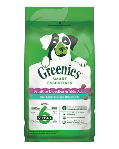 The Greenies brand is on a mission to promote your dog's well-being from teeth to tail! Greenies Smart Essentials Sensitive Digestion & Skin Adult High Protein Dry Dog Food Real Lamb & Brown Rice Recipe offers science-backed nutrition with an irresistible taste. This nutritious dog food recipe features real chicken as the #1 ingredient and is designed to help support 6 key areas of your dog's health: digestion, immune system, teeth, skin & coat, bones & joints, and muscles, including the heart. Greenies Smart Essentials Adult Dry Dog Food is formulated without corn, wheat, soy, or chicken by-product meal and no artificial flavors or preservatives*. Made with natural ingredients plus vitamins, minerals, and nutrients, Greenies Smart Essentials Adult High Protein Dry Dog Food is guaranteed to bring joy to mealtime with tail-wagging flavor. Love it or your money back! *Trace amounts may be present due to potential cross-contact during manufacturing. We will be glad to work with you to ensure that you feed your dog quality food for optimal health and happiness by providing the best selection and value on premium dog food for sale in Indiana.