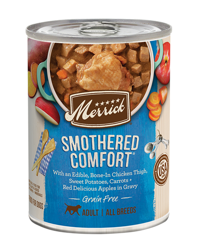 At Uncle Bill’s Pet Center, we not only offer Merrick dog food for sale, we also employ a highly trained staff that can assist you in finding an appropriate formula. Merrick's Smothered Comfort Canned Dog Food features edible, safe to eat, bone-in chicken thigh with all the southern fixins to make any mealtime special. This grain free recipe mixes carrots, sweet potatoes and red apples smothered together in a delicious gravy. All Merrick canned recipes can be served as a topper for dry kibble or a nutritious standalone meal. We will be glad to work with you to ensure that you feed your dog quality food for optimal health and happiness by providing the best selection and value on premium dog food for sale in Indiana.