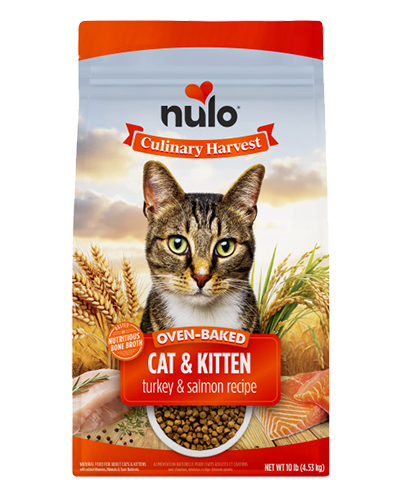 Oven-baked and basted in savory bone broth, Nulo Culinary Harvest™ delivers crave-worthy nutrition to nourish cats at every stage. Our Turkey & Salmon recipe features 90% animal-based protein, starting with real deboned turkey to satisfy their carnivorous cravings. With prebiotic-rich miscanthus grass, nourishing omegas, and smaller kibble for kittens and adults alike, each bite supports lean muscles, gentle digestion, and radiant skin and coat—nourishing playful kitten days to grown-up cat naps. No fillers. No shortcuts. Just nutrition baked from the heart.