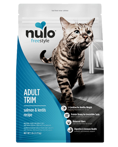 Fuel Incredible™ with Nulo FreeStyle Cat Food Trim Salmon & Lentils Recipe, a high-protein natural cat food designed to help adult cats maintain a lean body condition. With 83% of its protein from animal sources, this grain-free recipe features real deboned salmon as the #1 ingredient, delivering essential amino acids to support lean muscles, strength, and agility. Formulated with L-Carnitine to support fat metabolism and weight management, this recipe helps cats feel fuller for longer while maintaining energy levels. Guaranteed BC30 probiotics and prebiotic fiber promote digestive and immune health, while taurine supports heart function and vision. Made without grains, corn, wheat, soy, white potatoes, or tapioca, Nulo's natural weight management cat food provides nutrient-dense nutrition without fillers. Plus, our small, disc-shaped kibble encourages proper chewing and healthy digestion. Trust Nulo FreeStyle to fuel your cat’s inner athlete with the best premium, natural nutrition for cats—so you can enjoy more happy, healthy days together.