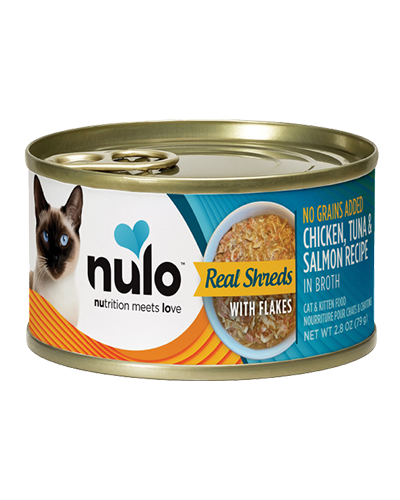 The shredded texture your cat loves, plus extra tasty tuna and salmon flakes take Nulo Real Shreds with Flakes to the next level making it the perfect complete and balanced meal for your feline friend. Plus, this grain-free formula is mixed with a savory broth to help keep them hydrated on their everyday adventures. Contains NO grains, carrageenan, meat by-products, corn, wheat, soy or artificial preservatives, colors or flavoring.