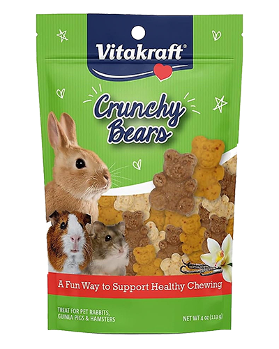Vitakraft Crunchy Bears Treat for Small Animals are fun, oven-baked rewards for rabbits, guinea pigs, hamsters and other small animals. Each ultra-crunchy bite is made without any artificial colors, flavors, or preservatives and helps encourages chewing to promote healthy tooth wear.