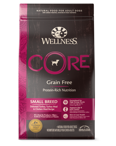 Crude Protein Not Less Than 36.00% Crude Fat Not Less Than 15.00% Crude Fiber Not More Than 5.00% Moisture Not More Than 10.00% Calcium Not More Than 2.00% Phosphorus Not More Than 1.30% Vitamin E Not Less Than 400 IU/kg Omega-6 Fatty Acids* Not Less Than 3.00% Omega-3 Fatty Acids* Not Less Than 0.50% Glucosamine* Not Less Than 250 mg/kg Chondroitin Sulfate* Not Less Than 200 mg/kg Beta-Carotene* Not Less Than 5 mg/kg Total Lactic Acid Microorganisms* Not Less Than 80,000,000 CFU/lb (Lactobacillus plantarum, Enterococcus faecium, Lactobacillus casei, Lactobacillus acidophilus in equal amounts) *Not recognized as an essential nutrient by the AAFCO Dog Food Nutrient Profiles Nutrition Statement Wellness CORE Small Breed Deboned Turkey, Turkey Meal & Chicken Meal Recipe is formulated to meet the nutritional levels established by the AAFCO Dog Food Nutrient Profiles for maintenance.